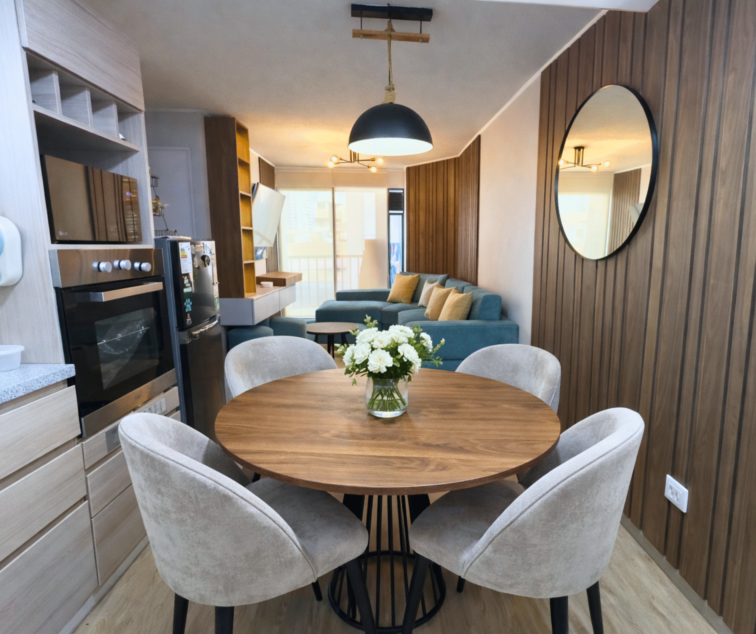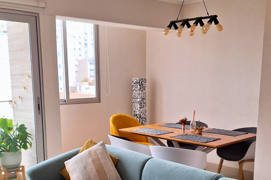 En Pravi Urban Home, implementamos el estilo Mid Century en la sala-comedor del nuevo departamento en Miraflores, destacando acabados de alta calidad con acentos en amarillo mostaza y turquesa para crear amplitud y serenidad. La iluminación estratégica optimiza el flujo, mientras nuestros muebles modernos y resistentes añaden sofisticación y durabilidad, realzando funcionalidad y estilo en un ambiente atemporal.